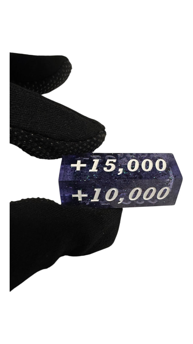 This beautiful resin dice has the 4 sides engraved with the order: +1 Critical, +1 Drive, Persona, Over. These dice use the same elements as transparent dice (one solid interior color) along with your addition of a multicolored or single colored foil. The multicolored foil almost looks like shredded leaves or what we like to call asteroids. The single colored foil is a shimmer almost like a night sky with twinkling stars when exposed to light.